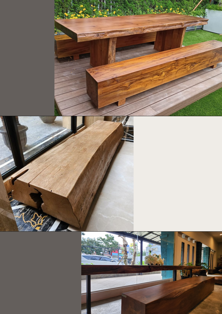 Bench yang terbuat dari kayu solid utuh adalah pilihan yang memikat untuk mengisi teras depan atau tempat berkumpul di dalam rumah. Keunikan kayu yang utuh menciptakan bench yang tidak hanya tahan lama tetapi juga memancarkan keindahan alami yang khas. Dengan daya tahan yang luar biasa, bench ini menjadi solusi sempurna untuk menambahkan elemen estetis dan fungsional di area seperti teras atau ruang bersosialisasi di dalam rumah. Fungsinya yang serbaguna membuatnya cocok untuk digunakan sebagai tempat duduk ekstra saat mengundang tamu atau sebagai tempat santai yang nyaman untuk menikmati momen bersama keluarga.